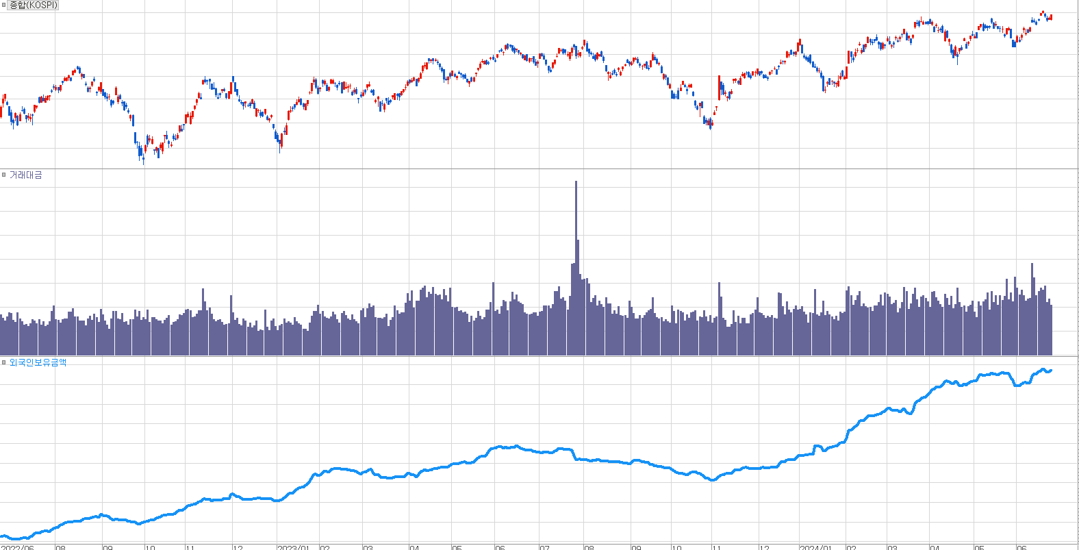 [ 2022년 중반 이후 코스피 지수와 거래대금 그리고 외국인 보유 금액 추이 ]