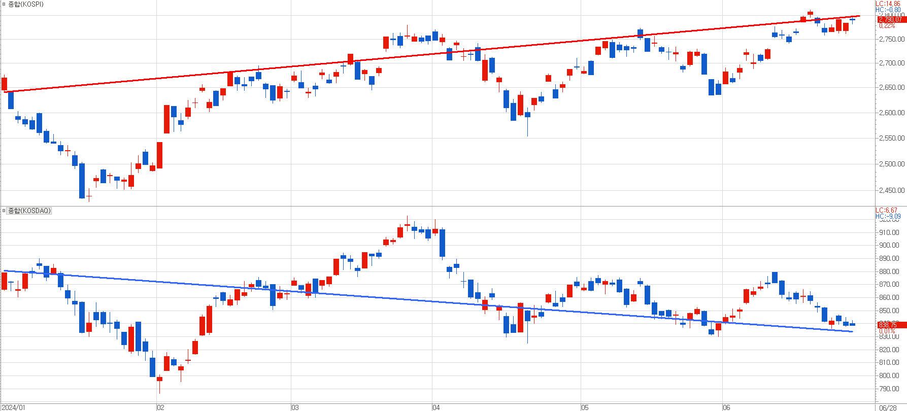 [ 코스피(상단) 지수와 코스닥(하단)지수의 올해 상반기 추이 ]