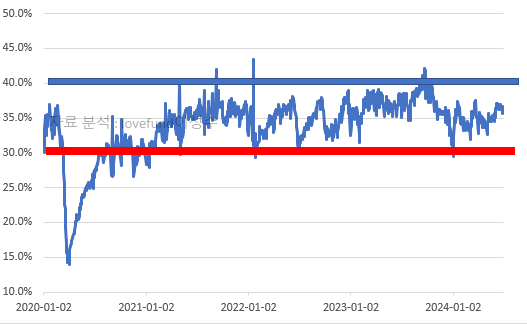(예탁금 대비) 신용융자 비율이 40%를 넘어서면 시장에 외풍이 불 경우 단기 급락이 발생할 가능성이 매우 높아집니다. 단적으로 2023년 9월 말과 2022년 1월에 40% 선을 넘어섰고 일시적으로 증시에 충격이 발생하였습니다.