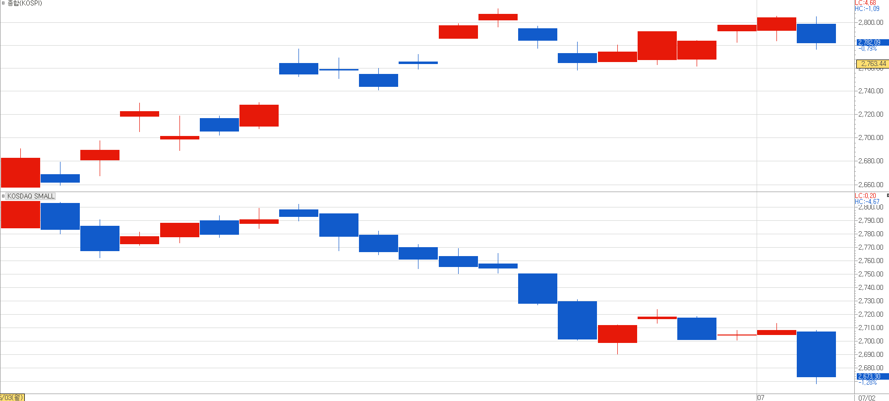 이러한 현상은 처음에는 코스닥(KQ) 소형주에서 나타나더니, 점점 코스닥(KQ) 중형주에서 관찰되기 시작하였고, 7월 증시를 시작한 이번 주 코스피(유가증권) 시장 소형주에서도 관찰되고 있습니다. (그나마 코스피 소형주는 코스닥 중소형주에 비해 상대적으로 낙폭은 적은 편입니다.)