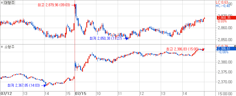 [ 오늘 장중 코스피 대형주와 소형주 업종 지수 분봉 추이 ]