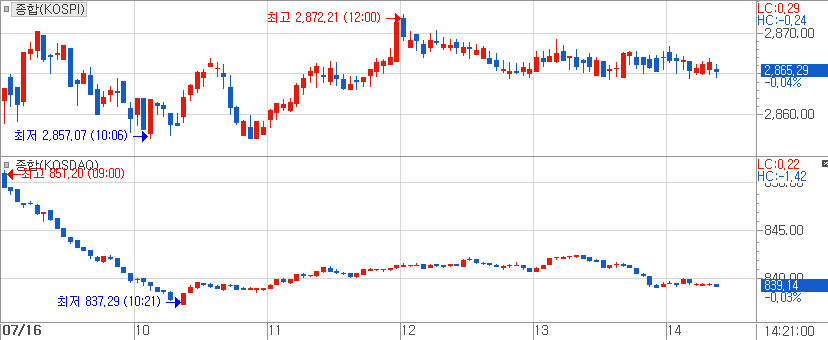 [ 오늘 장중 코스피(상단)와 코스닥(하단) 지수 분봉 추이 ]