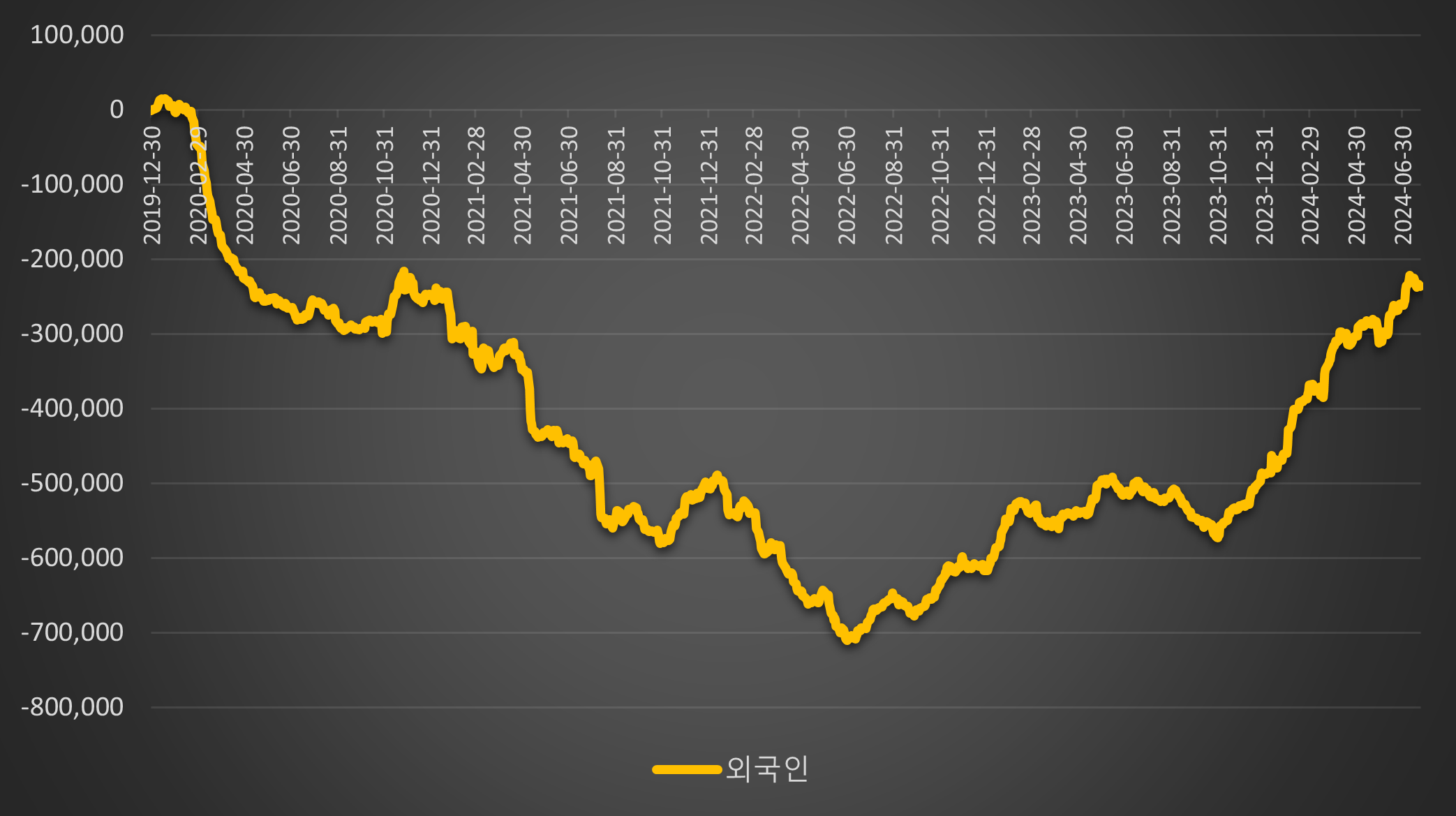 [ 2020년 이후 2024년 7월 최근까지 외국인 투자자의 한국 주식 누적 순매매추이 ]