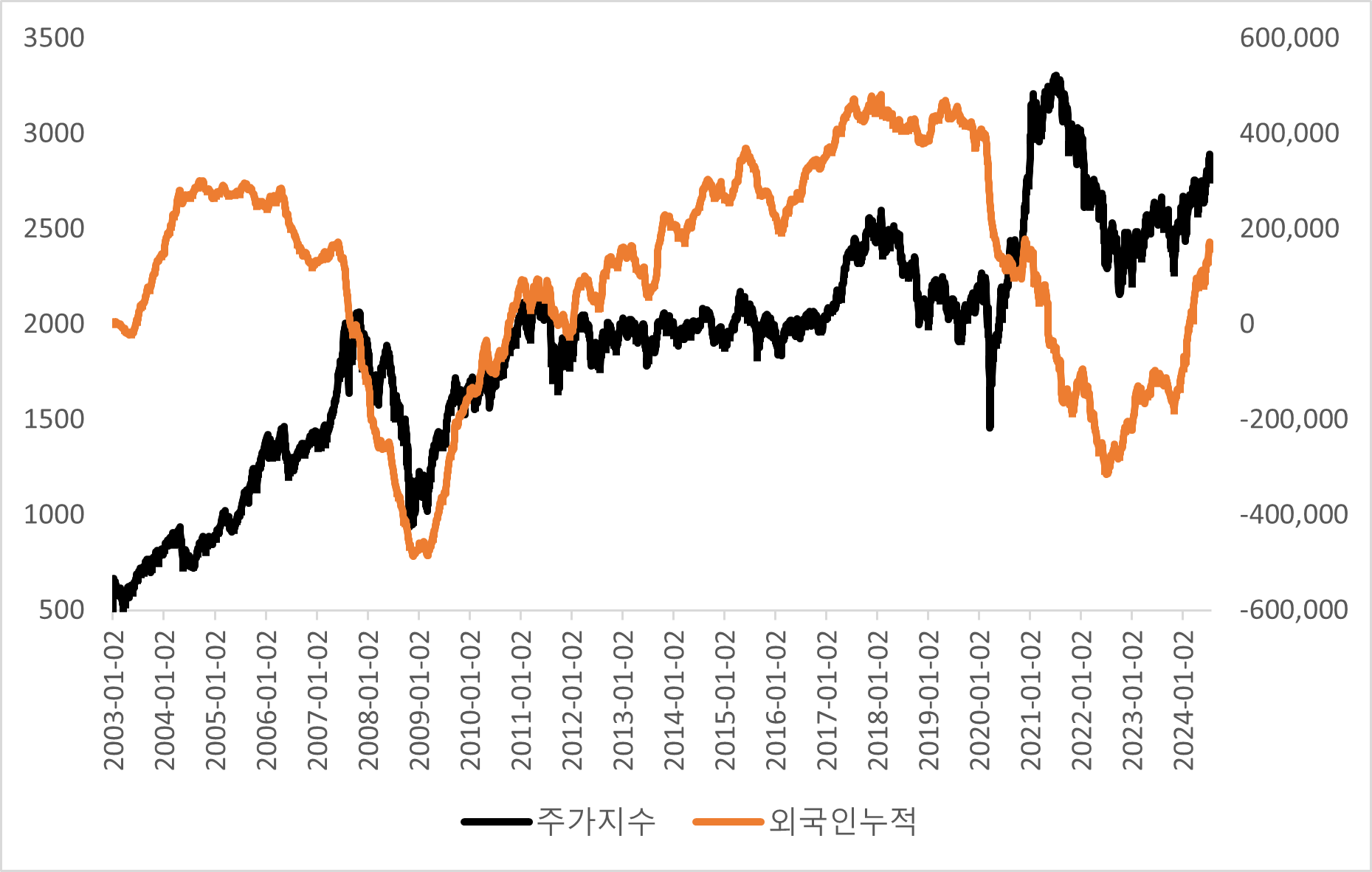 [ 2003년 이후 최근까지 코스피 지수(흑색선)와 외국인 누적 순매매(황색선) 추이 ]