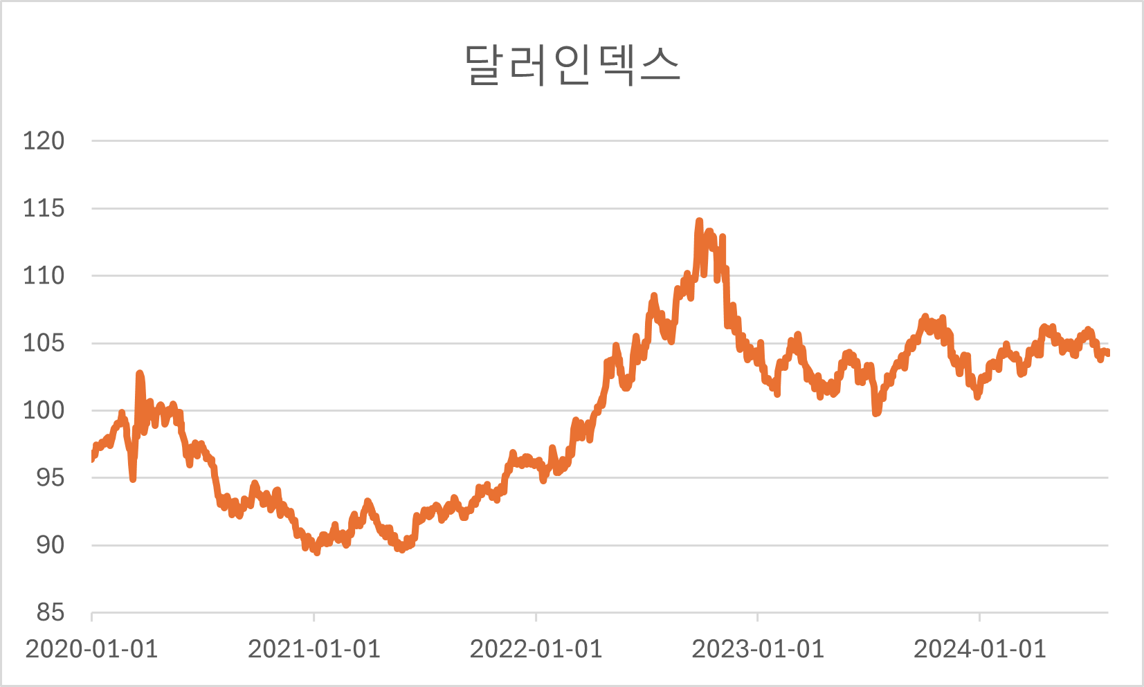 [ 2020년 이후 2024년 7월 최근까지 달러인덱스 추이. 원자료 참조 : 인베스팅 ]