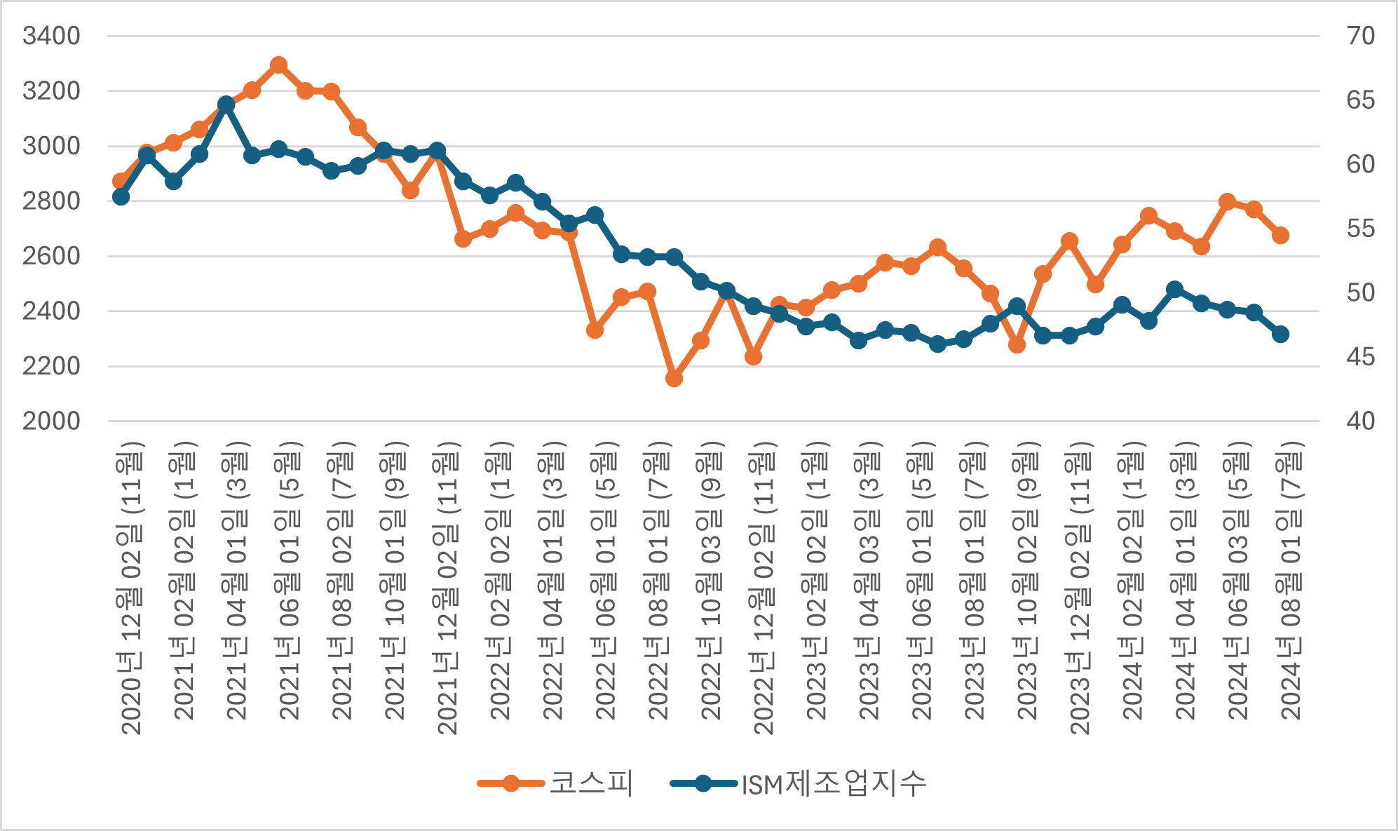 [ ISM제조업지수와 코스피 종합지수 추이. 자료참조 : 인베스팅 ]