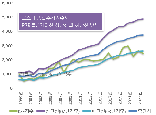 [ 코스피 지수와 시장 PBR 밴드. 자료 분석 : lovefund이성수 / 원자료 참조 : KRX ]