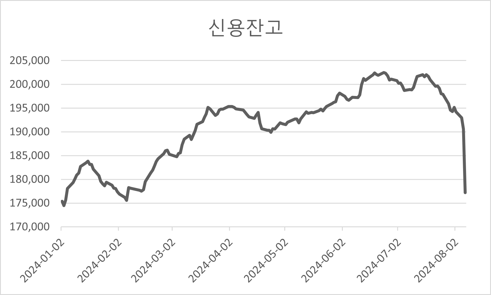하지만 7월 중순 이후 조정장과 지난주 8월 2일 블랙프라이데이 그리고 이번 주 8월 5일 블랙먼데이를 거치면서 신용융자 규모는 올해 연초 수준인 17조 7,191억 원으로 다시 들어왔습니다.