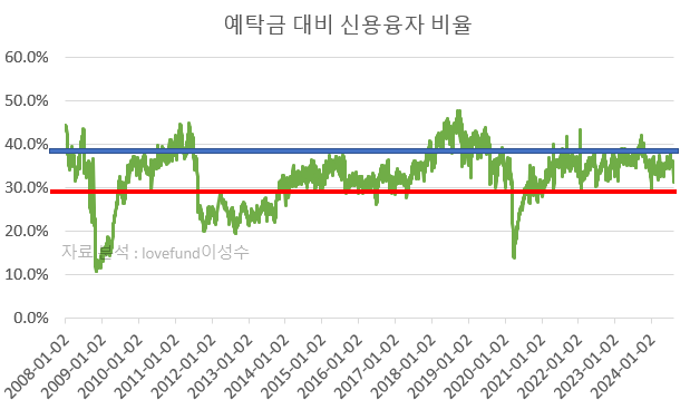 [ 2008년 이후 2024년 최근까지의 예탁금 대비 신용융자 비율 ]