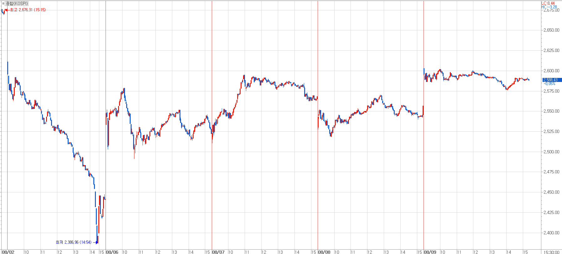 [ 이번 주 블랙먼데이 이후 주식시장 분봉 흐름 ]