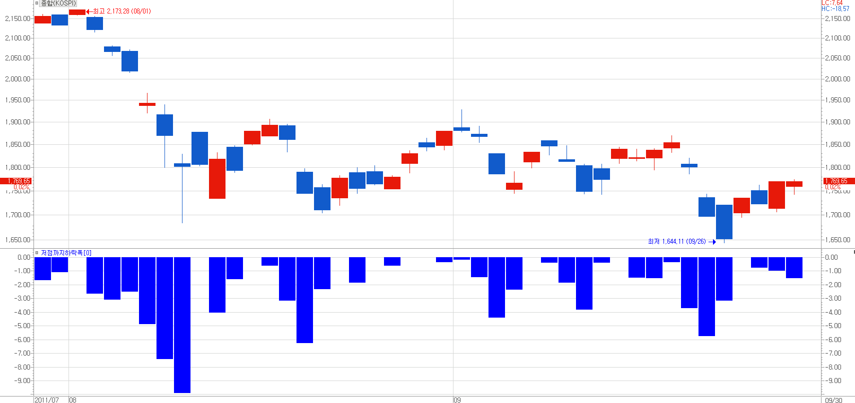 급등락을 반복하였고, 변동성 장세는 두 달여 지속되었습니다. 이 과정에서 당시 코스피 지수는 은근슬쩍 하락세가 지속되었고, 9월 말 10월 초가 되어서야 바닥을 잡았습니다.