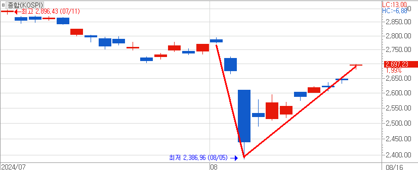 8월 초에 발생한 블랙데이의 낙폭이 오늘 증시 반등으로 대부분 만회되었습니다. 8월 2일 블랙프라이데이, 8월 5일 블랙먼데이 단 이틀 만에 발생한 10%대 중후반의 증시 낙폭은 언제 그랬냐는 듯 주가지수는 8월 초 수준으로 복귀하였습니다.