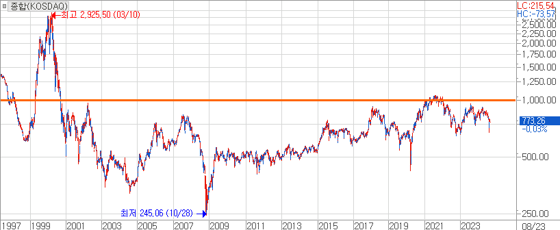 [ 수십 년간 코스닥지수는 1,000p를 제대로 넘어보지도 못하였다. ]