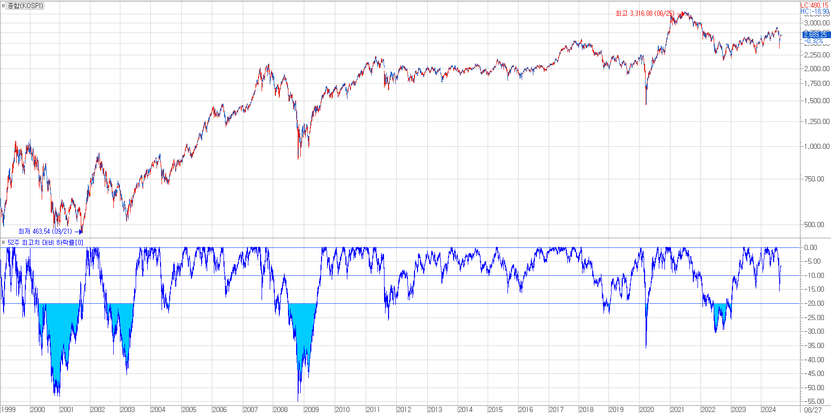[ 1999년 이후 코스피 지수의 52주 최고치 대비 하락률 ]