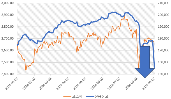 첫 번째로는 증시가 폭락하면서 강제 청산/마진콜이 연이어 발생할 때입니다. 하지만 이런 상황은 신용융자를 사용하는 투자자 본인이나 증시 전체에 큰 부담을 안겨주는 상황입니다. 이렇게 시장이 급하게 하락할 때 가장 빠르게 신용융자 잔고가 급감하는 것이 사실입니다만, 개인투자자가 받는 충격은 상당할 수밖에 없습니다.