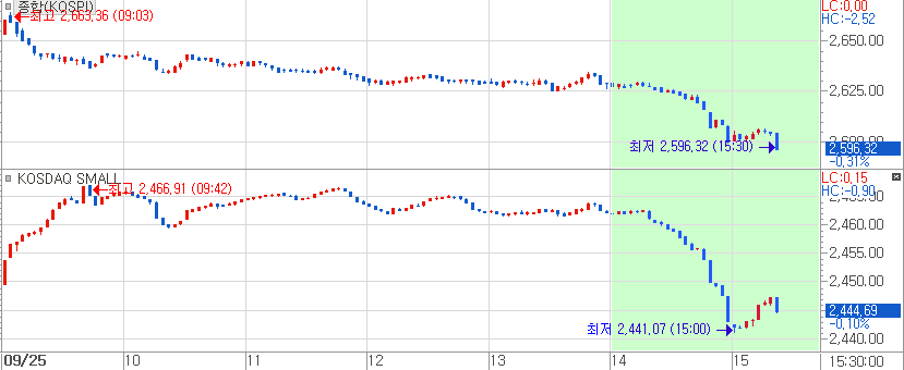 [ 금일 장중 오후 2시 이후로 날카로운 급락이 발생한 코스피지수와 코스닥 small 지수 ]