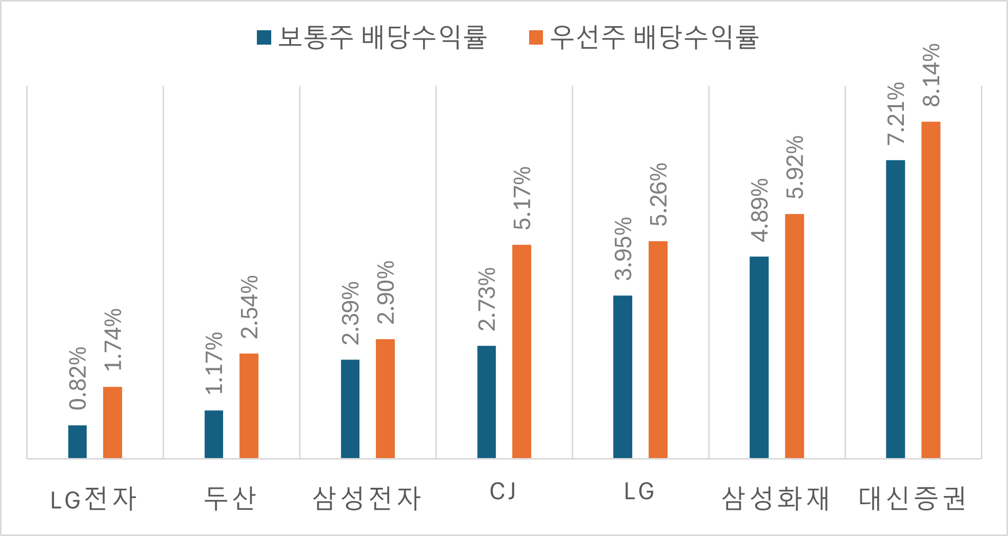 앞서 언급 드린 바처럼 우선주는 주주로서의 권리가 없다 보니 주가가 디스카운트 되어 거래됩니다. 하지만 보통주가 배당하면 액면가에 1%p 더 많이 지급되지요. 그러다 보니 이 두 가지 효과가 복합적으로 작용하면서 보통주보다도 높은 배당수익률이 형성됩니다.
