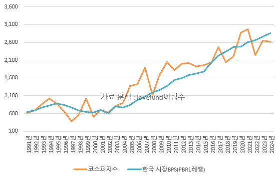 [ 1990년 초 이후 한국 코스피 시장의 PBR 1x 레벨과 코스피 지수 추이 ]