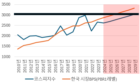 [ 코스피 지수와 PBR 1x 레벨 그리고 2025년 이후 매년 3% 성장 가정 시 추이. ]
