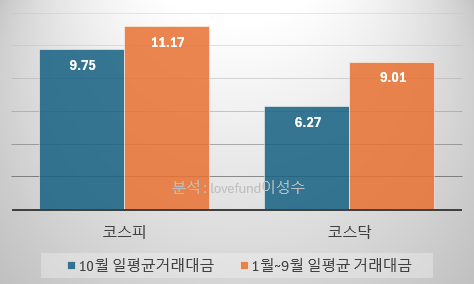 올해 연초부터 9월 말까지 일평균 코스피 거래대금이 11조 원을 넘었던 것을 감안한다면 10월 들어 거래대금이 –10%나 감소한 상황입니다.