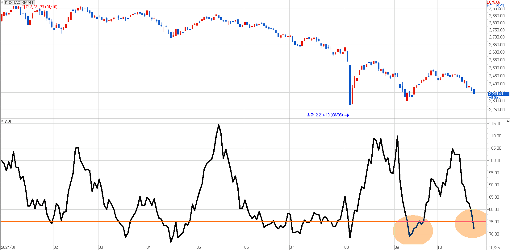 위의 도표는 올해 코스닥Small지수의 추이와 시장 전체의 ADR 지표를 함께 보여주고 있습니다. 스몰캡의 약세를 코스닥Small 지수 추락에서 노골적으로 볼 수 있습니다. 그런데, 최근 ADR 지표는 75 미만으로 내려와 70선을 붕괴시키려 하고 있습니다. ADR 지표가 크게 밀렸다는 것은 최근 하락 종목 수가 상승 종목 수보다 압도적으로 많았음을 보여줍니다. 즉, 개별 종목의 낙폭이 무차별적으로 나타나고 있음을 보여주고 있는 것이지요.