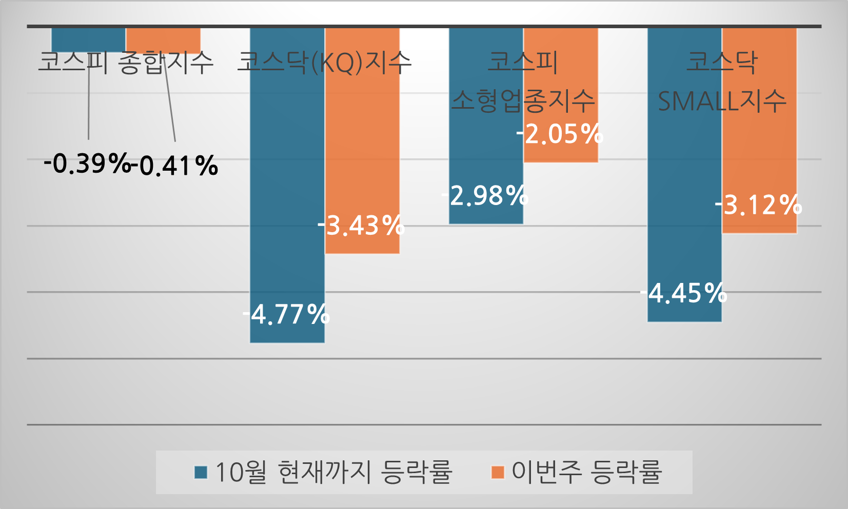 한주 내내 이어진 개별 종목의 낙폭은 급락장을 만난 듯 투자자들을 힘들게 하였습니다. 그나마 코스피 종합주가지수는 그런대로 잘 버티는 흐름이었습니다만, 코스닥 지수나 코스피 소형, 코스닥 Small지수는 거의 매일 하락하면서 제법 깊은 하락을 만들고 말았습니다.