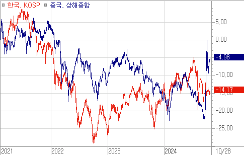 이에 따라 글로벌 증시에서의 낙제생은 한국 증시만 남게 되었습니다. 그나마 옆에서 같이 꼴찌를 다투었던 중국증시가 갑자기 우등생으로 변하였으니 한국 증시 입장에서는 부러운 모습이 아닐 수 없습니다. 마치, 학창 시절 같이 학교에서 꼴찌를 경쟁했던 친구가 고등학교 3학년에 되어 각성하고 공부를 열심히 한 다른 친구가 전교 상위권까지 올라선 것처럼 부럽기도 하고 한편 배가 아픈 상황이 되고 말았습니다.