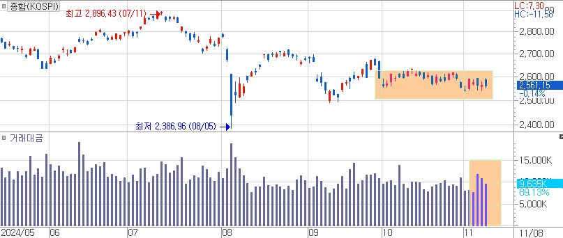 그리고 다음 날부터는 더 큰 이벤트가 기다리고 있었지요. 화요일부터 수요일로 이어진 미국 대선 투표와 개표 과정이 바로 그것이었습니다. 우리 시간으로 화요일에는 잠시 해리스가 앞서는 분위기도 있었지만 결국은 압도적인 표 차이로 트럼프가 징검다리 재선에 성공하였습니다. 그리고 우리 증시는 이후 트럼프 발 불확실성에 대한 우려감에 무거운 증시 흐름을 보여주었습니다.