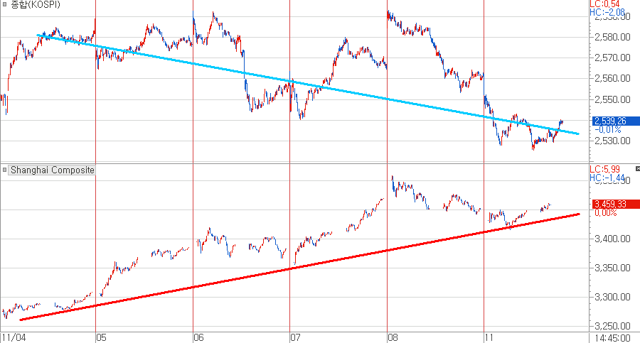 [ 지난주 월요일 이후 중국 증시는 한국증시보다 강한 흐름을 만들고 있다. ]