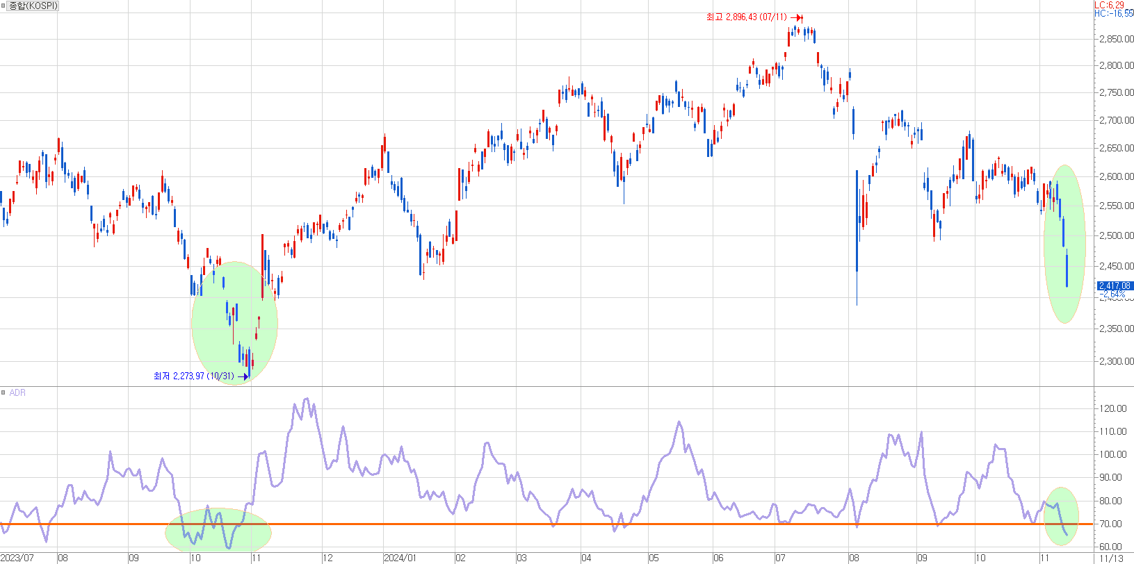[ 최근 급락장으로 ADR 레벨은 작년 가을 급락장 수준까지 내려왔다. ]