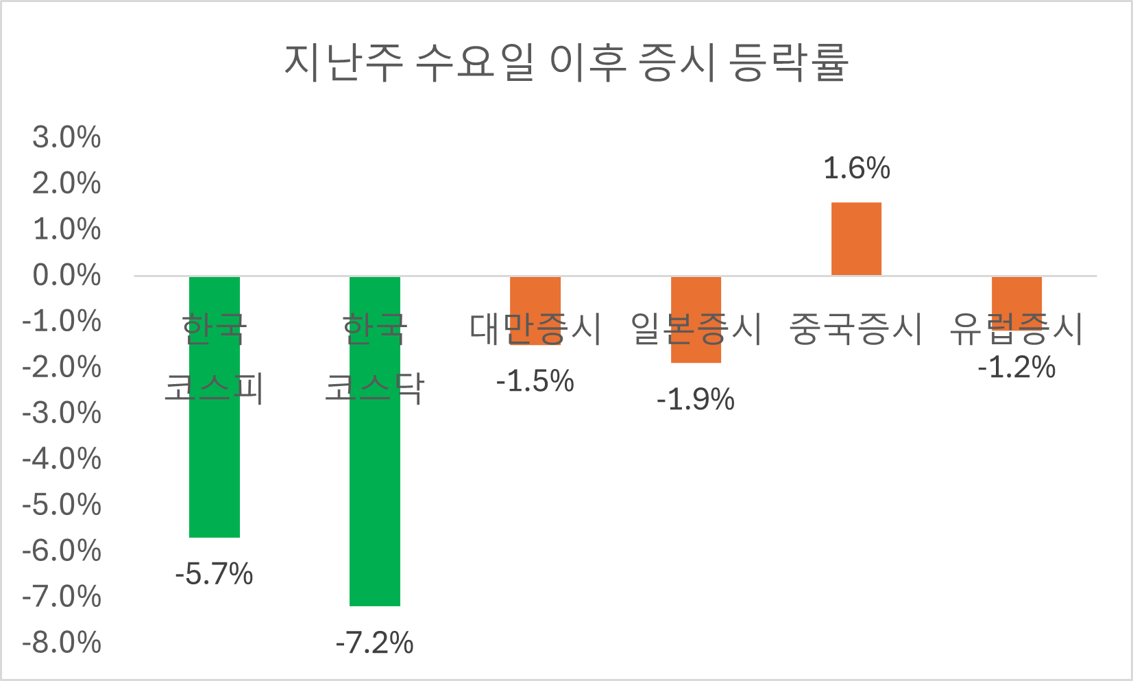 트럼프 당선이 확실시된 지난 수요일 이후 오늘까지 코스피 지수는 –5.7% 하락, 코스닥 지수는 –7.2% 하락하였습니다. 같은 기간 다른 나라들 증시도 급락하였다면, 어느 정도 지금 증시 상황을 인정할 수 있을 것입니다. 하지만 다른 국가들 증시를 보면 상대적으로 너무도 양호합니다.