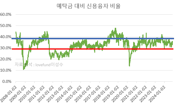 [ 2008년 이후 예탁금 대비 신용융자 비율 추이. ]