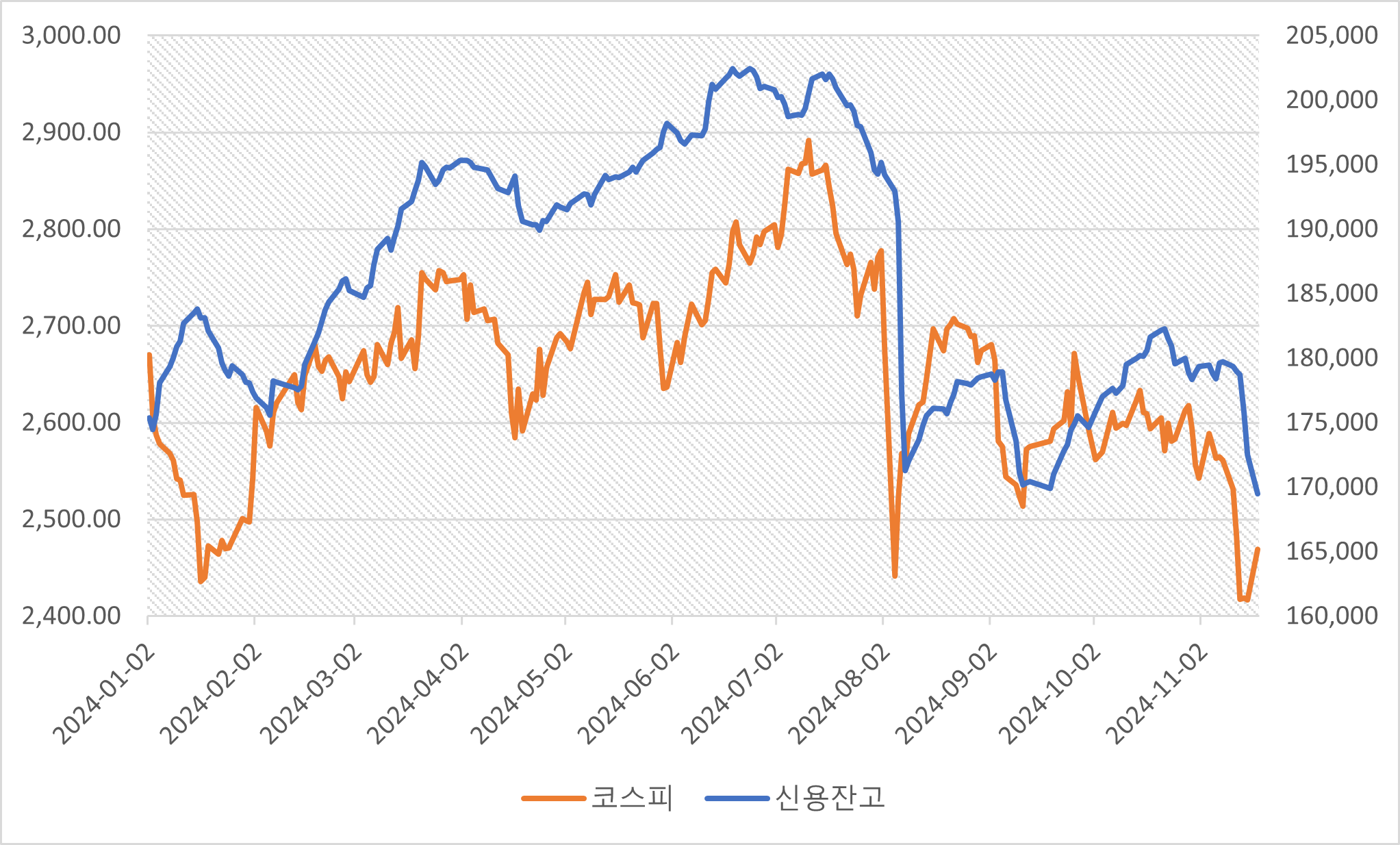 [ 2024년 올해 현재 코스피 지수와 신용융자 잔고 추이. 원자료 : 금융투자협회 통계 ]