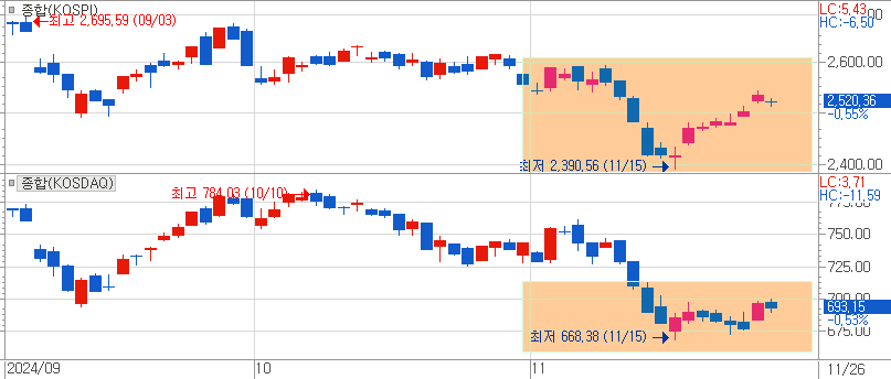 2주 전 11월 중순만 하더라도 주식시장은 끝없이 무너질 듯한 한국 증시만의 고독한 급락장이 연이어졌었습니다. 이에 따라 11월 15일 금요일에는 장중 코스피 지수가 2,400p를 붕괴시키면서 아마겟돈이 열린 듯 투자자들의 불안감과 공포 심리는 극단에 이르렀습니다.