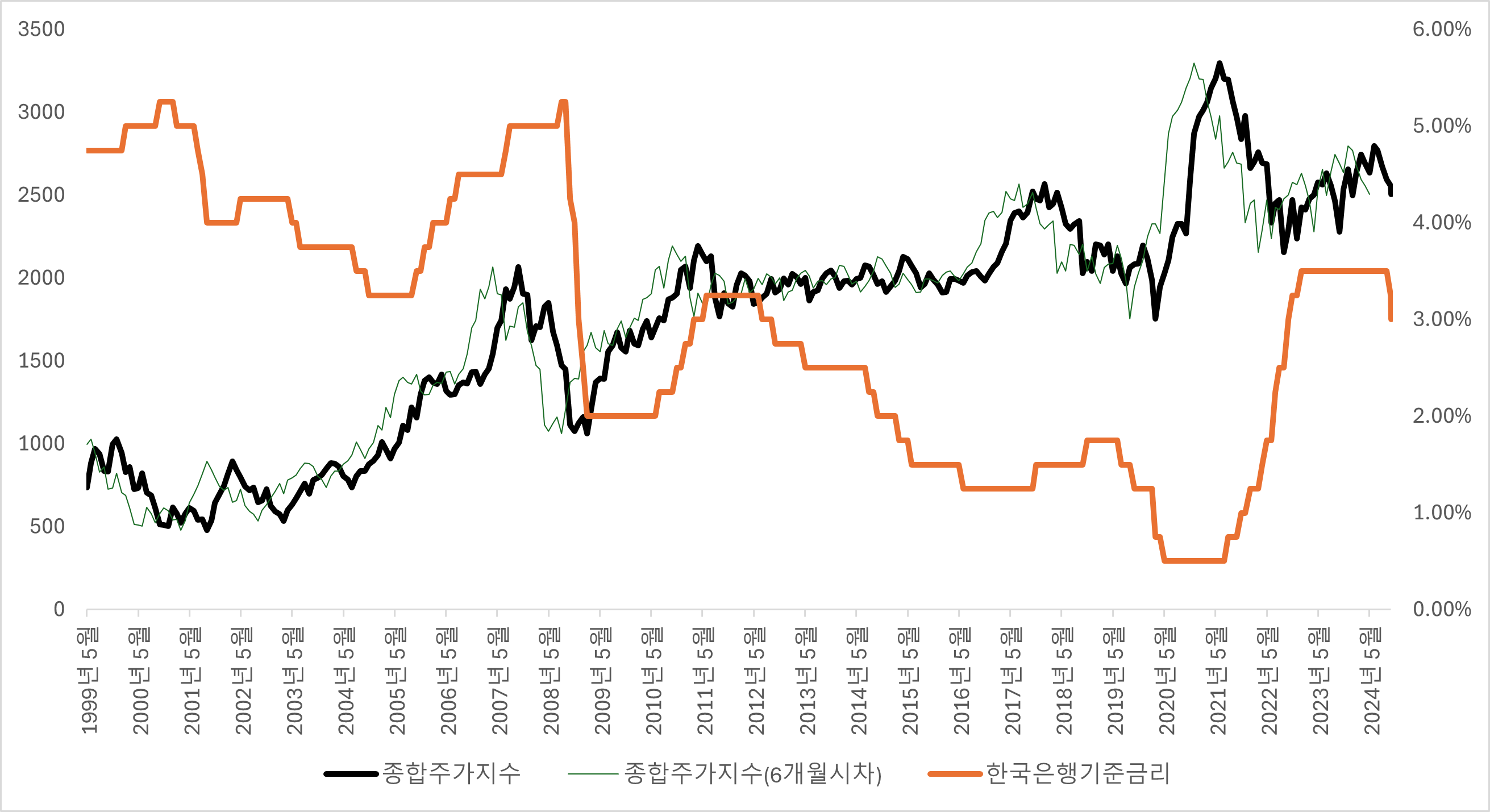 [ 1999년 이후 코스피 지수와 한국은행 기준금리 추이. 원자료 : 한국은행/KRX ]
