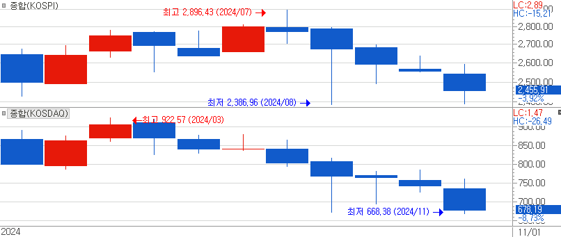 2000년 들어 월봉 기준 주가지수가 5개월이상 연속 음봉하락한 경우는 2000년 닷컴버블 붕괴와 2008년 금융위기 두차례만 있었습니다. 매우 드믄 5개월 연속 음봉하락 현상이 2024년 11월 증시 하락으로 확정되고 말았습니다.