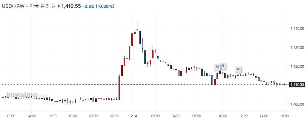 [ 123 계엄령 사태 이후 발생한 달러원 환율의 급변동. 자료 : 인베스팅닷컴 ]