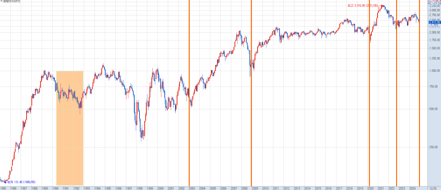 1990년의 경우 2년에 걸쳐서 증안기금이 투입되었는데 당시 금융기관들이 무리하게 차입하여 자금을 투입했다 보니 IMF 사태의 한 원인이 되었다고 평가받긴 합니다만, 이후 1995년까지 시장은 훈훈한 온기가 이어졌습니다.