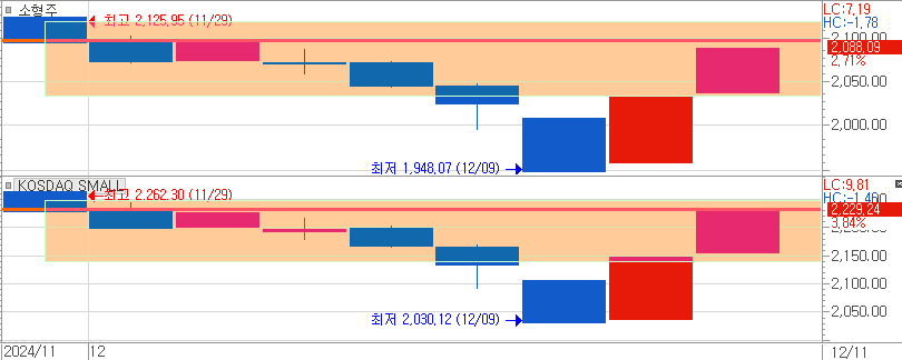이는 어쩌면 집 나갔던 자금 중 일부가 계엄 사태로 인해 저평가 영역까지 하락한 스몰캡들을 금투세 부담이 없어지면서, 저가 매수세가 발생하면서 나타나고 있는 현상으로 볼 수 있겠습니다.