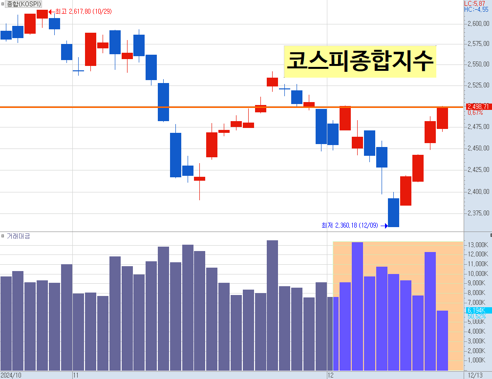 반가운 증시 반등이 나흘 연속 이어지고 있습니다. 특히 오전장보다 오후장에 더 강한 흐름이 나타나면서 시장은 12.3 계엄 사태의 쇼크를 회복하였습니다. 드디어 V자 반등의 결과 다시 원점으로 돌아온 것입니다.