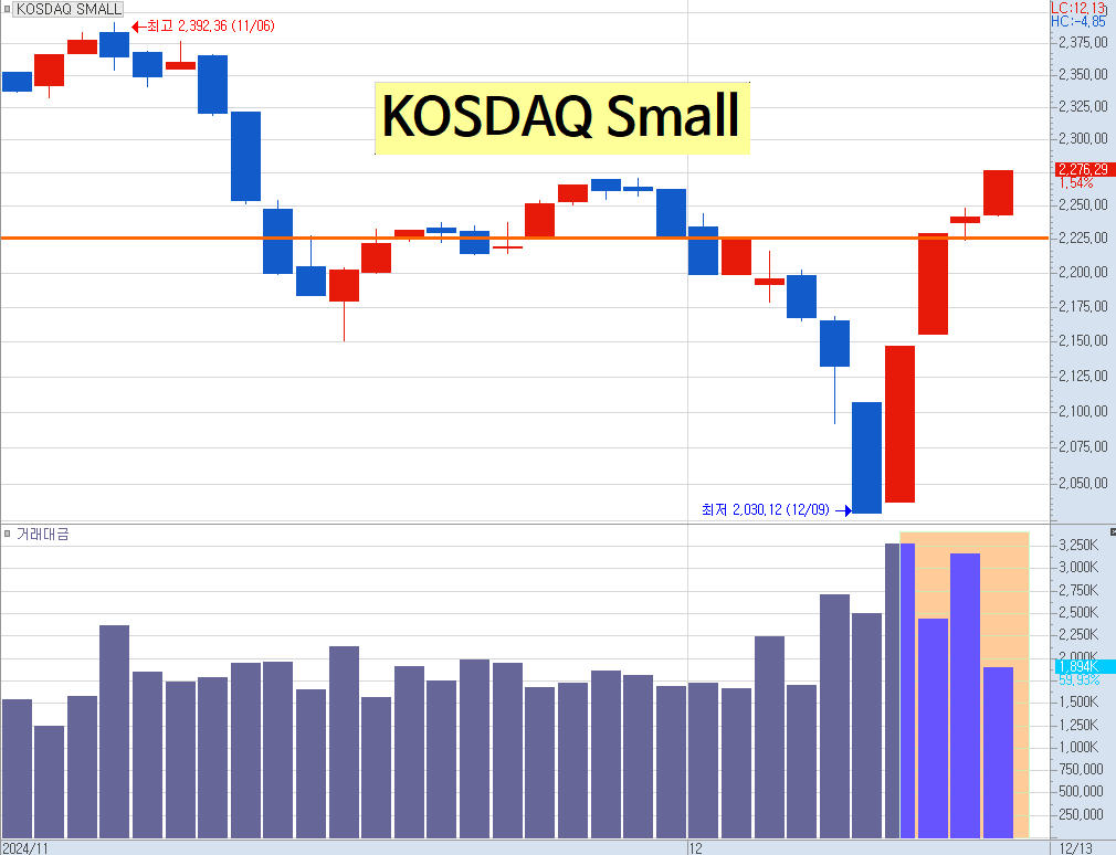 마지막으로 스몰캡 중에서도 소형주 지수라 할 수 있는 KOSDAQ Small 지수를 보도록 하겠습니다. 코스닥 Small 지수는 이미 12월 3일 종가를 훨씬 뛰어넘었을 뿐만 아니라 거래대금 또한 크게 증가하였습니다. 올해 초 3~4조 원이었던 KOSDAQ Small 지수의 일간 거래대금은 올해 내내 꾸준히 감소하면서 1조 원대 중반까지 감소하였었습니다만, 최근 나흘간의 반등 동안 거래대금은 2~3조 원대 수준까지 회복하였습니다.