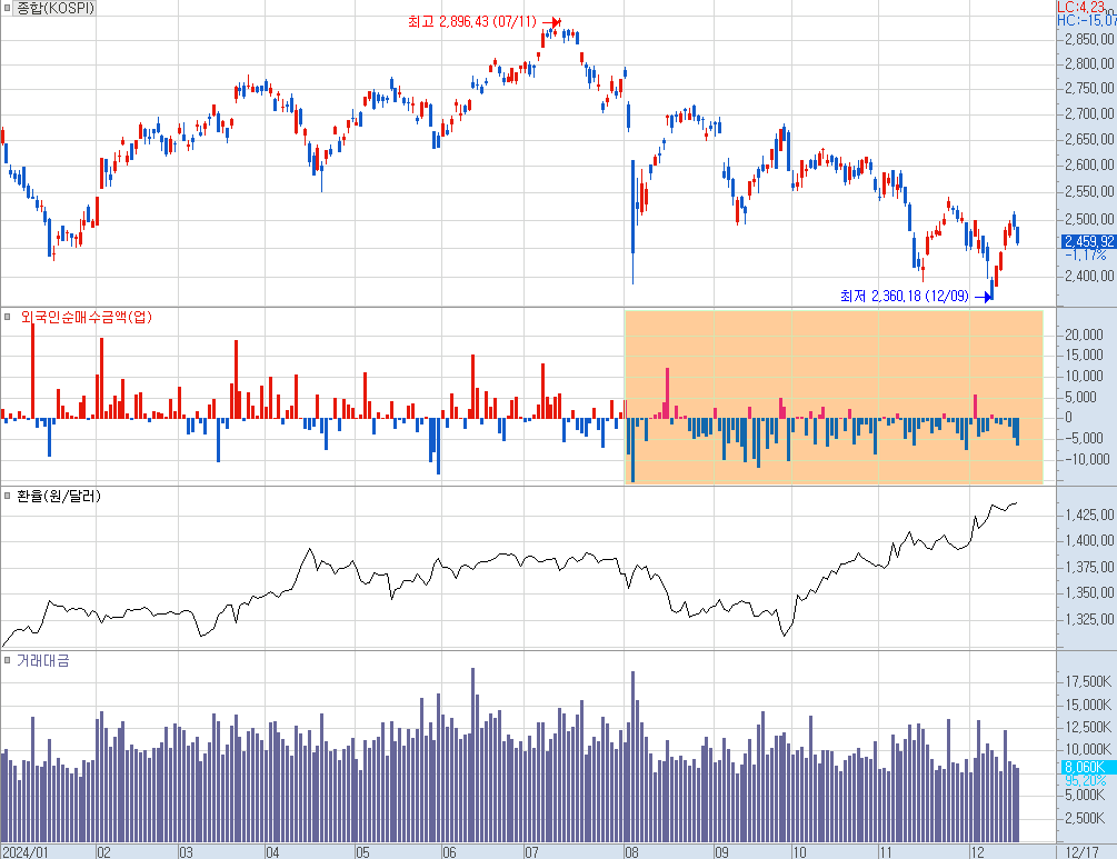 하지만, 12.3 계엄 사태 이후, 외국인은 스탠스를 정반대로 바꾸면서 코스피 시장에서 단 하루를 빼고 연일 매도하면서 –2조 4천억 원이 넘는 순매도를 기록하였습니다.