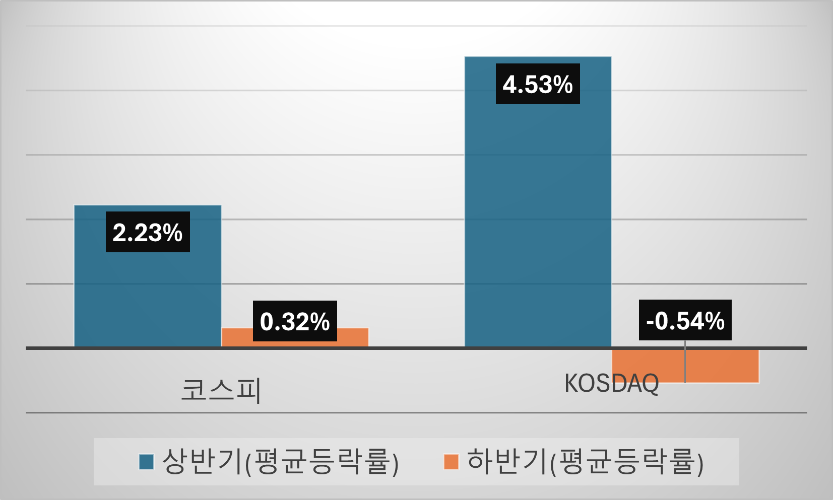 등락률을 비교해 보아도, KOSDAQ 시장의 상반기 평균 등락률은 +4.53%로 코스피 시장보다 더 탄력적인 수치를 보여주었습니다. 하지만 하반기에는 평균 –0.54% 하락이라는 아쉬운 흐름을 만들었습니다.