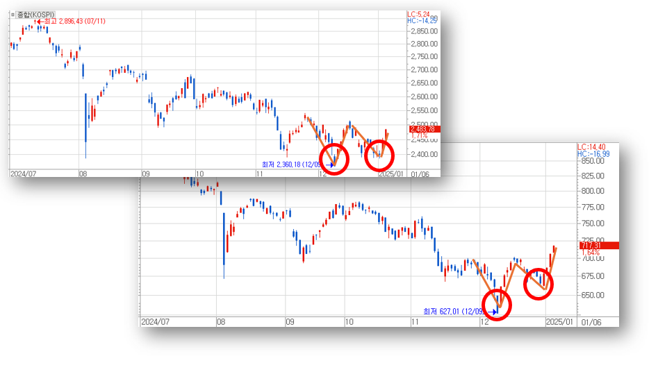 [ 코스피(상단)와 코스닥(하단) 양 시장 모두 오랜 하락 후에 쌍바닥을 만들고 있다. ]