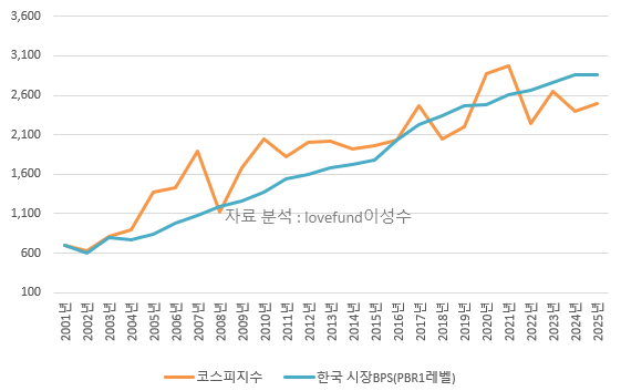 [ 코스피 지수와 시장 PBR 1레벨. 분석 : lovefund이성수, 원자료 참조 : KRX ]