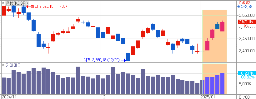 [ 새해 1월 효과 속에 코스피 2,500p 탈환과 거래대금 증가가 나타나고 있다 ]