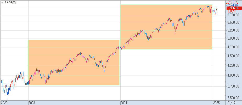 [ 미국 주식시장은 지난 2년 유례가 드문 2년 연속 20%대 지수 상승률을 기록하였다 ]