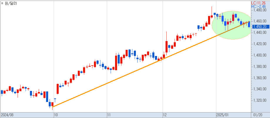 [ 달러환율은 의외로 하향 안정세를 보이면서, 오늘 장중 1,450원이 붕괴하기도 하였다. ]