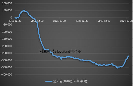 [ 2020년 연초부터 2025년 최근까지의 연기금 누적 순 매매 추이 ]