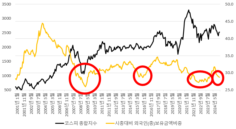 위의 시기에 특징들을 보면 4번의 케이스 중 2021년~24년 2월까지의 케이스를 제외하고 외국인이 주도적으로 매도하면서 시총 비중이 낮아졌습니다. 즉, 한국 주식을 급하게 매도하였던 것이지요. 그에 반해 2021년~24년 2월의 사례 중 2021년~2022년은 동학개미 운동 속에 외국인 투자자가 피동적으로 한국 주식을 매도하였던 시기입니다.